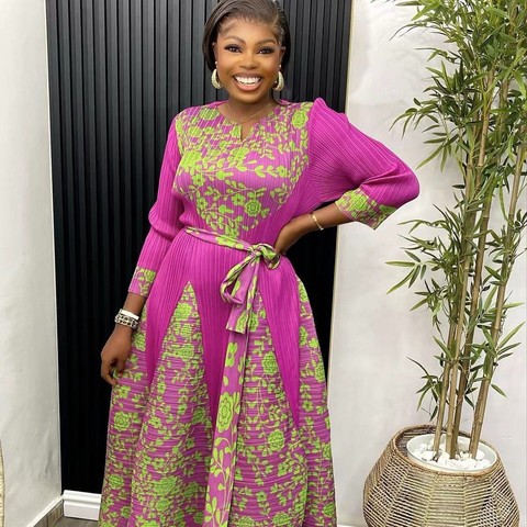 미야케 주름 원피스 긴 캐주얼 단색 라운드 넥 나팔 소매 주름 이슬람 Dubai Abaya 플러스 사이즈 여성의 드레스